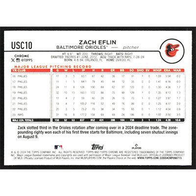 This is a 2024 Topps Chrome Update X-Fractors Zach Eflin baseball card. The card is #USC10 and pictures show condition.