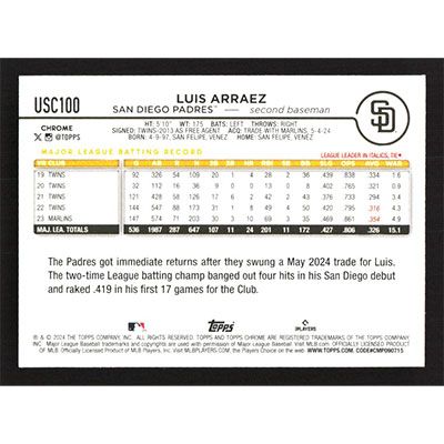 This is a 2024 Topps Chrome Update X-Fractors Luis Arraez baseball card. The card is #USC100 and pictures show condition.