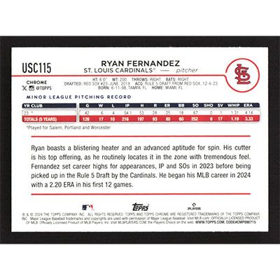 This is a 2024 Topps Chrome Update X-Fractors Ryan Fernandez baseball card. The card is #USC115 and pictures show condition. Team(s): St. Louis Cardinals Rookie Card (RC)