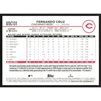This is a 2024 Topps Chrome Update X-Fractors Fernando Cruz baseball card. The card is #USC131 and pictures show condition.