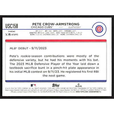This is a 2024 Topps Chrome Update X-Fractors Pete Crow-Armstrong baseball card. The card is #USC158 and pictures show condition.