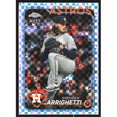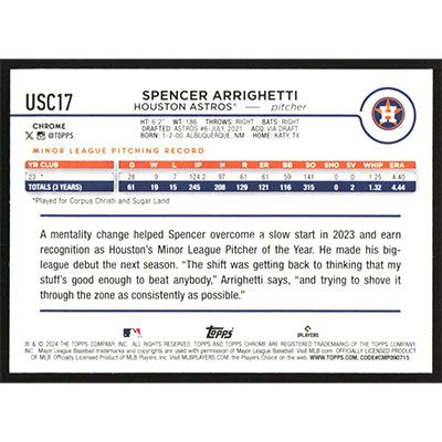 This is a 2024 Topps Chrome Update X-Fractors Spencer Arrighetti baseball card. The card is #USC17 and pictures show condition.