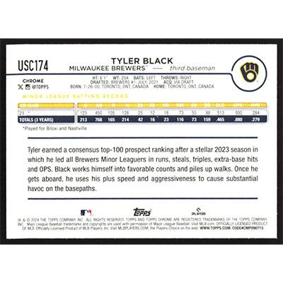 This is a 2024 Topps Chrome Update X-Fractors Tyler Black baseball card. The card is #USC174 and pictures show condition.
