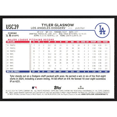 This is a 2024 Topps Chrome Update X-Fractors Tyler Glasnow baseball card. The card is #USC39 and pictures show condition.