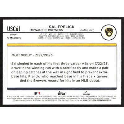 This is a 2024 Topps Chrome Update X-Fractors Sal Frelick Rookie Debut baseball card. The card is #USC61 and pictures show condition. Team(s): Milwaukee Brewers Rookie Card (RC)