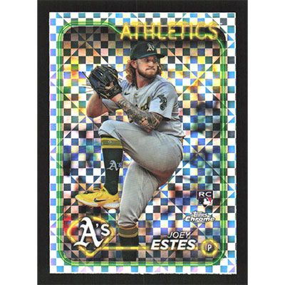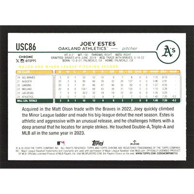 This is a 2024 Topps Chrome Update X-Fractors Joey Estes baseball card. The card is #USC86 and pictures show condition. Team(s): Oakland Athletics Rookie Card (RC)
