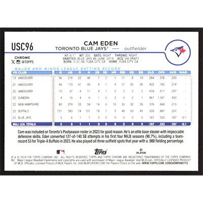 This is a 2024 Topps Chrome Update X-Fractors Cam Eden baseball card. The card is #USC96 and pictures show condition. Team(s): Toronto Blue Jays Rookie Card (RC)