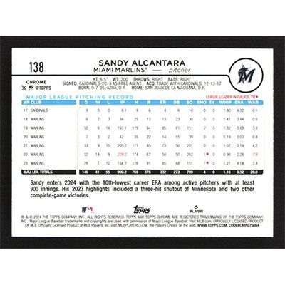 This is a 2024 Topps Chrome X-Fractors Sandy Alcantara baseball card. The card is #138 and pictures show condition.