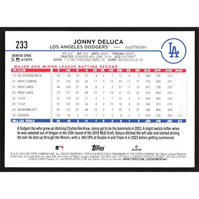 This is a 2024 Topps Easter Foil Jonny Deluca baseball card. The card is #233 and pictures show condition. Team(s): Los Angeles Dodgers Rookie Card (RC)