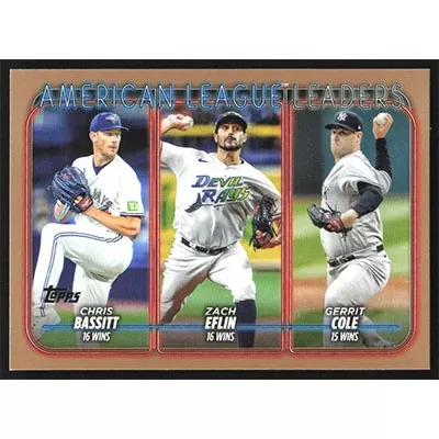 This is a 2024 Topps Gold Chris Bassitt, Zach Eflin and Gerrit Cole League Leaders baseball card. The card is #57 and pictures show condition. This card is limited; #'d 1796/2024.