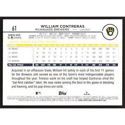 This is a 2024 Topps Gold Foil William Contreras baseball card. The card is #61 and pictures show condition.