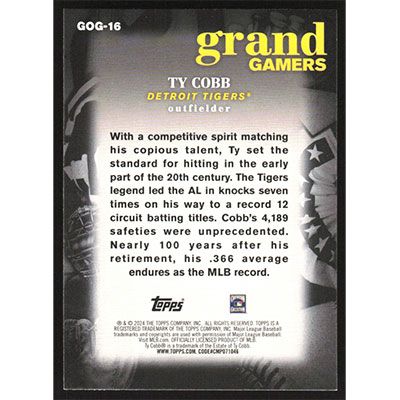 This is a 2024 Topps Grand Gamers Ty Cobb baseball card. The card is #GOG-16 and pictures show condition.