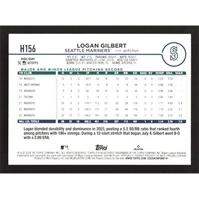 This is a 2024 Topps Holiday Logan Gilbert baseball card. The card is #H156 and pictures show condition.