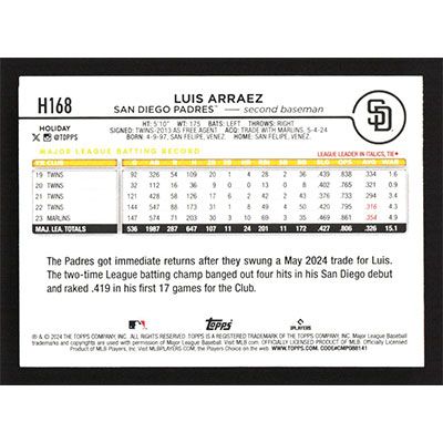 This is a 2024 Topps Holiday Luis Arraez baseball card. The card is #H168 and pictures show condition.
