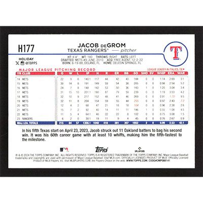 This is a 2024 Topps Holiday Jacob deGrom baseball card. The card is #H177 and pictures show condition.