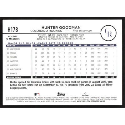 This is a 2024 Topps Holiday Hunter Goodman baseball card. The card is #H178 and pictures show condition.