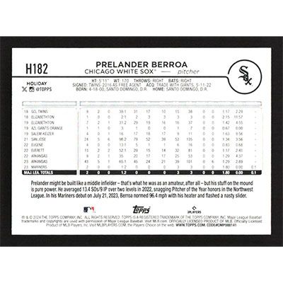 This is a 2024 Topps Holiday Prelander Berroa baseball card. The card is #H182 and pictures show condition. Team(s): Chicago White Sox Rookie Card (RC)