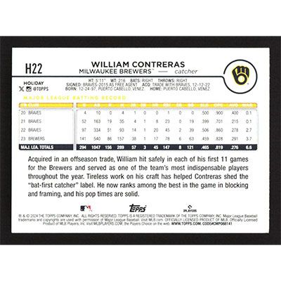 This is a 2024 Topps Holiday William Contreras baseball card. The card is #H22 and pictures show condition.