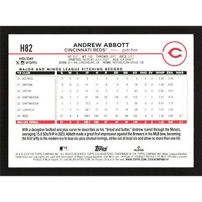 This is a 2024 Topps Holiday Andrew Abbott baseball card. The card is #H82 and pictures show condition.