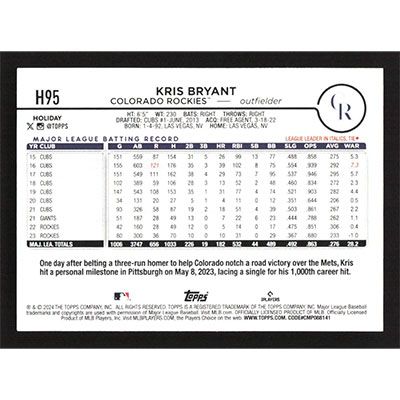 This is a 2024 Topps Holiday Kris Bryant baseball card. The card is #H95 and pictures show condition.