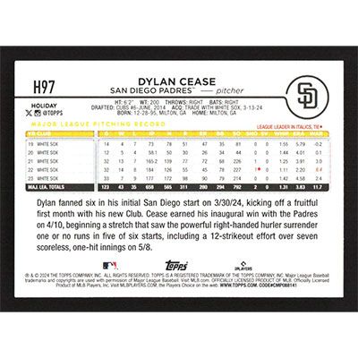 This is a 2024 Topps Holiday Dylan Cease baseball card. The card is #H97 and pictures show condition.