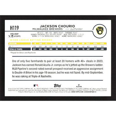 This is a 2024 Topps Holiday Metallic Blue Tree Jackson Chourio baseball card. The card is #H119 and pictures show condition. Team(s): Milwaukee Brewers Rookie Card (RC)