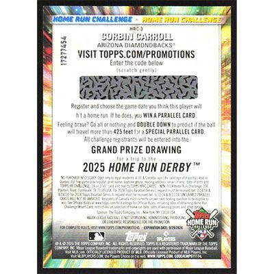 This is a 2024 Topps Home Run Challenge Code Cards Corbin Carroll baseball card. The card is #HRC-3 and pictures show condition. Team(s): Arizona Diamondbacks