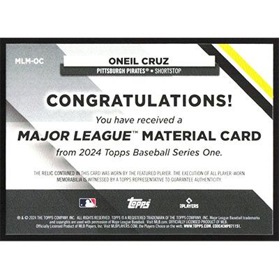 This is a 2024 Topps Major League Material Oneil Cruz Jersey baseball card. The card is #MLM-OC and pictures show condition. Team(s): Pittsburgh Pirates