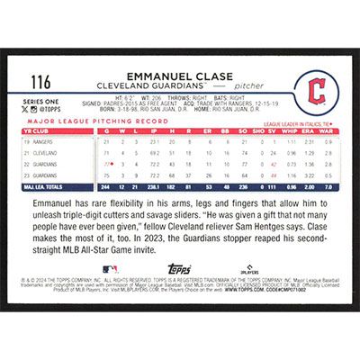 This is a 2024 Topps Rainbow Foil Emmanuel Clase baseball card. The card is #116 and pictures show condition.
