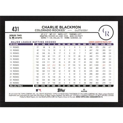 This is a 2024 Topps Rainbow Foil Charlie Blackmon baseball card. The card is #431 and pictures show condition.