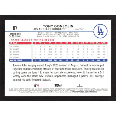This is a 2024 Topps Rainbow Foil Tony Gonsolin baseball card. The card is #87 and pictures show condition.