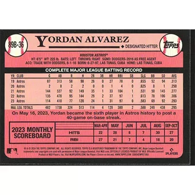 This is a 2024 Topps Series '89 Yordan Alvarez baseball card. The card is #89B-36 and pictures show condition.