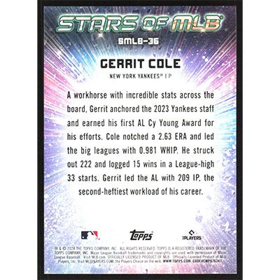 This is a 2024 Topps Stars of MLB Gerrit Cole baseball card. The card is #SMLB-36 and pictures show condition.