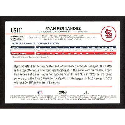 This is a 2024 Topps Update Halloween Orange and Black Foil Ryan Fernandez baseball card. The card is #US111 and pictures show condition. Team(s): St. Louis Cardinals Rookie Card (RC)