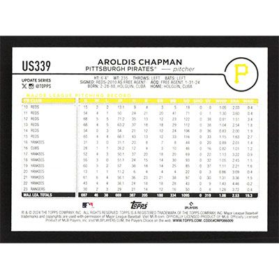 This is a 2024 Topps Update Rainbow Foil Aroldis Chapman baseball card. The card is #US339 and pictures show condition.