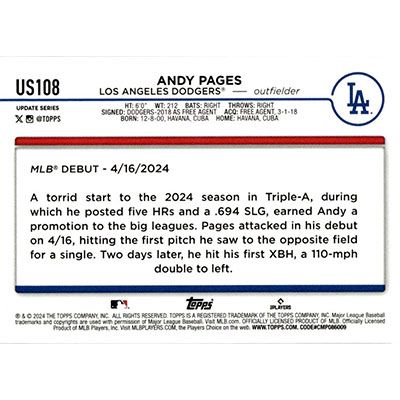 This is a 2024 Topps Update Andy Pages Rookie Debut baseball card. The card is #US108 and pictures show condition. Team(s): Los Angeles Dodgers Rookie Card (RC)