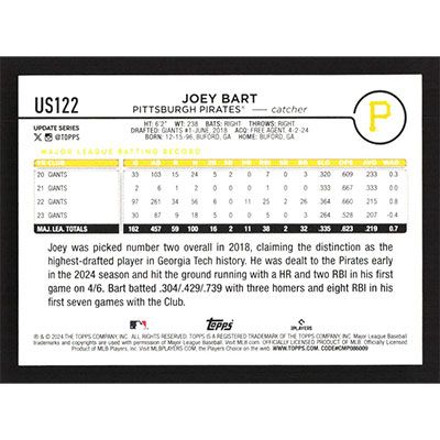 This is a 2024 Topps Update Joey Bart baseball card. The card is #US122 and pictures show condition.