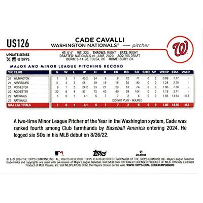 This is a 2024 Topps Update Cade Cavalli baseball card. The card is #US126 and pictures show condition.