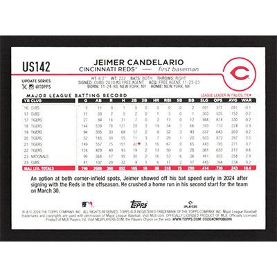 This is a 2024 Topps Update Jeimer Candelario baseball card. The card is #US142 and pictures show condition.