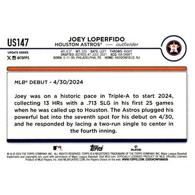 This is a 2024 Topps Update Joey Loperfido Rookie Debut baseball card. The card is #US147 and pictures show condition. Team(s): Houston Astros Rookie Card (RC)