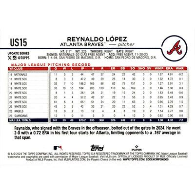 This is a 2024 Topps Update Reynaldo Lopez baseball card. The card is #US15 and pictures show condition.