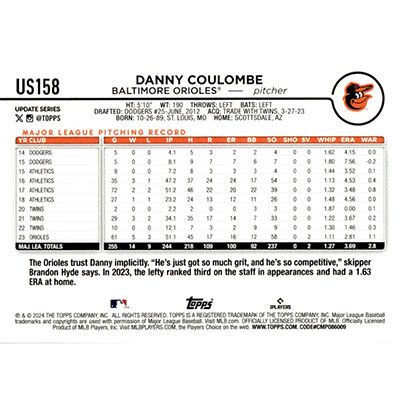 This is a 2024 Topps Update Danny Coulombe baseball card. The card is #US158 and pictures show condition.