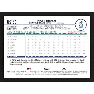 This is a 2024 Topps Update Matt Brash baseball card. The card is #US168 and pictures show condition.