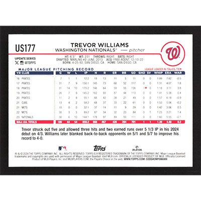 This is a 2024 Topps Update Trevor Williams baseball card. The card is #US177 and pictures show condition.