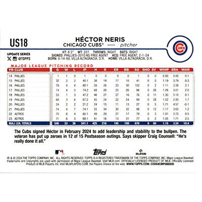 This is a 2024 Topps Update Hector Neris baseball card. The card is #US18 and pictures show condition.