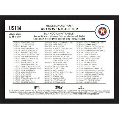 This is a 2024 Topps Update Ronel Blanco Season Highlights Checklist baseball card. The card is #US184 and pictures show condition. Team(s): Houston Astros Rookie Card (RC)