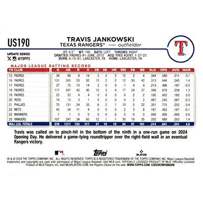 This is a 2024 Topps Update Travis Jankowski baseball card. The card is #US190 and pictures show condition.