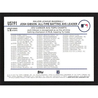This is a 2024 Topps Update Josh Gibson Highlights Checklist baseball card. The card is #US191 and pictures show condition.