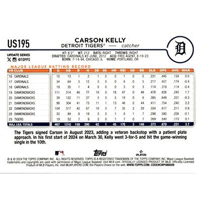 This is a 2024 Topps Update Carson Kelly baseball card. The card is #US195 and pictures show condition.