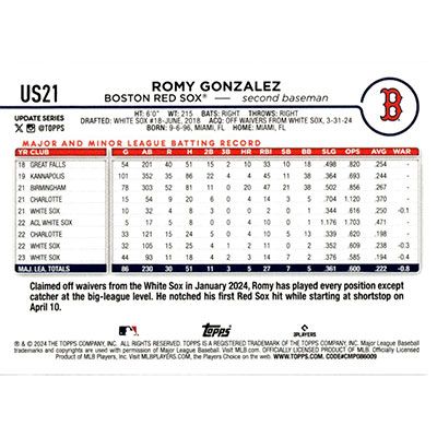 This is a 2024 Topps Update Romy Gonzalez baseball card. The card is #US21 and pictures show condition.